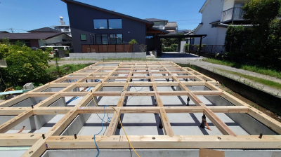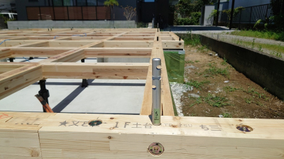 土台、大引きを組み終えたら床断熱材を設置してその上から床パネルを固定します。