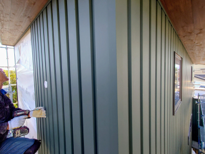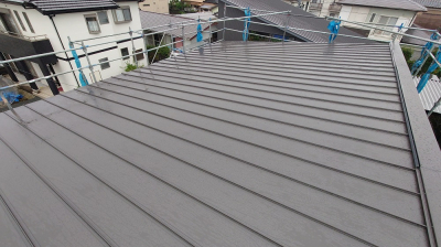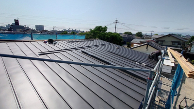片流れ屋根の立平葺き仕様。 軒先から棟まで継ぎ目のない屋根材が直線的に広がります。