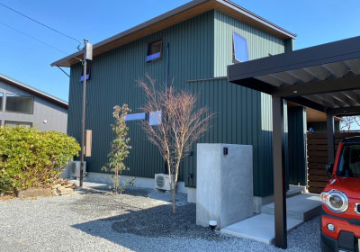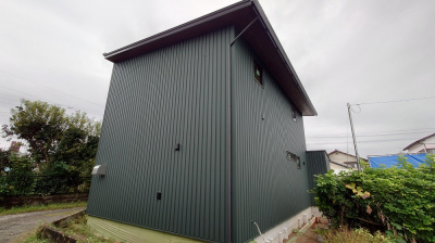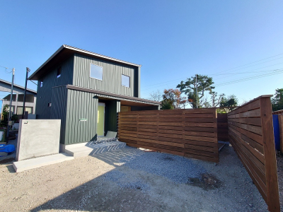 屋根まで伸びる、継ぎ目の無いガルバリウム鋼板の外壁はすっきりとした印象を与えます。