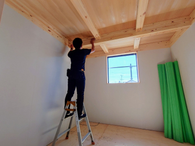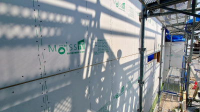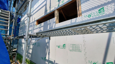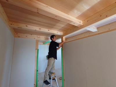 モイス自体が化粧材で一発仕上げ施工となります。 さらにフォレストの家は柱、梁を見せる真壁造りのため、その内側に隙間なく綺麗にモイスを納めていかなくてはなりません。