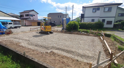 鋤取り後は砕石を敷き均し転圧し防湿フィルムを敷き、 建物外周部に捨てコンクリートを打設します。