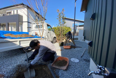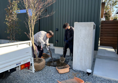 外構工事の仕上げ...木々を選びに山へ向かいました。