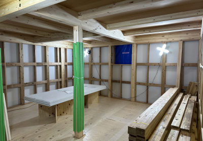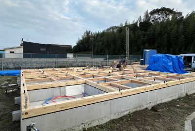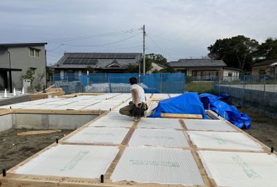 碁盤の目状に土台が敷き終わると 続いては断熱材を隙間なくはめ込んでいきます。
