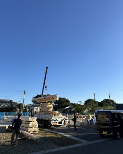 秋晴れの中、早朝からお施主様に駆けつけていただき建て方工事を開始しました。