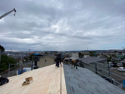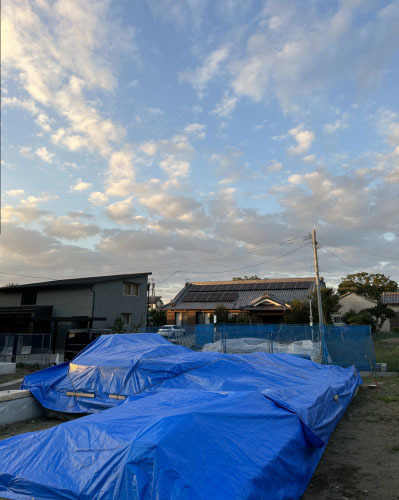 サッシが取り付くまで建物全体も丁寧にブルーシートで包み、建て方工事無事完了です!