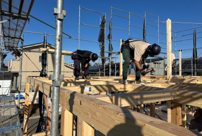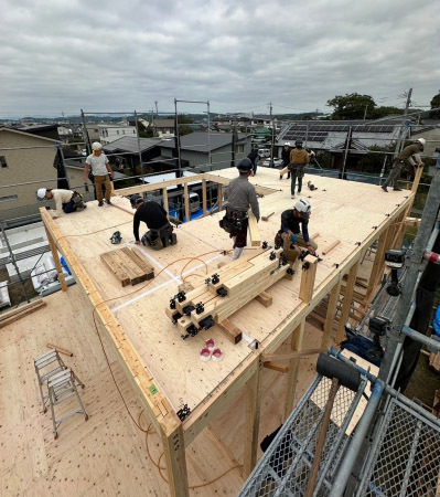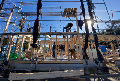 建て方工事、1日で屋根までの構造体を組み上げていく日。