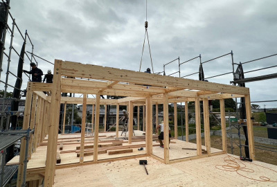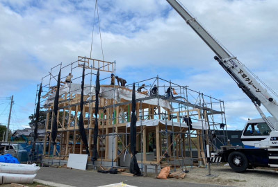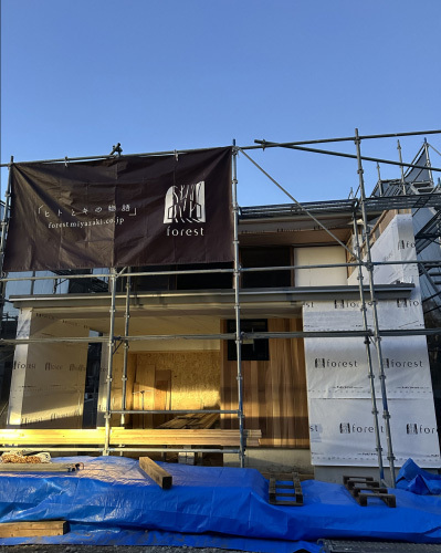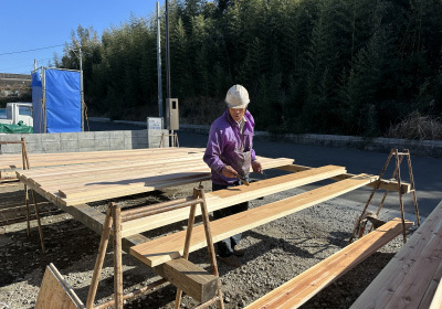 上棟へ向け工事の進む『Roof Gardens』 先日は木材の加工工場にて『番付』を実施しました。