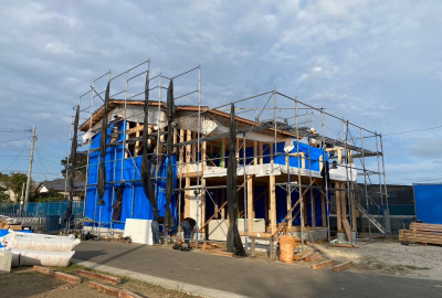 サッシ取付と外壁下地が完了した『Roof Gardens』