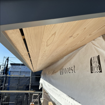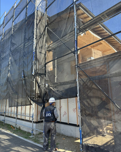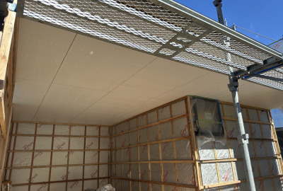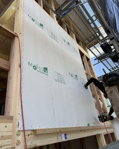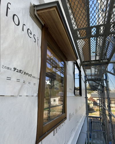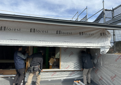 外部moissが貼り終わると、遮熱性の高い透湿防水シートで綺麗にラッピングします。