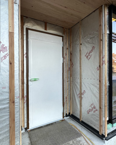 木製の玄関ドアも傷が付かない様にしっかり保護しました。