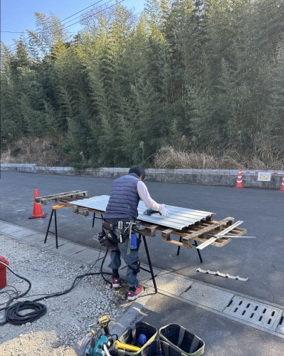Forestではガルバリウム鋼板の外壁を標準採用。 既製品ではなく長尺の鋼板を1枚1枚手作業で加工していきます。