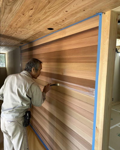 ウッドデッキや板塀で使う木材も搬入されました。 こちらも1枚ずつ刷毛で丁寧に塗装していきます。