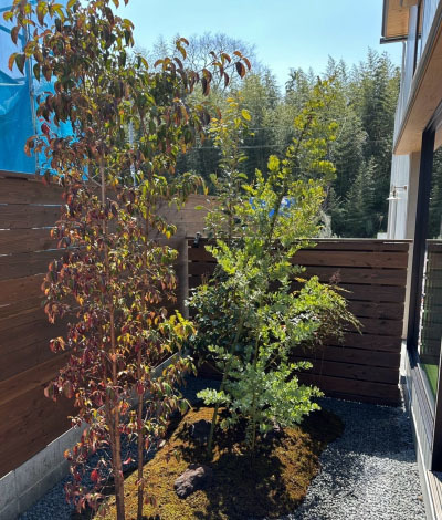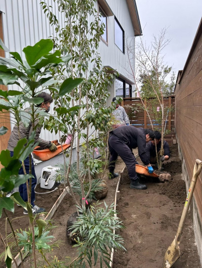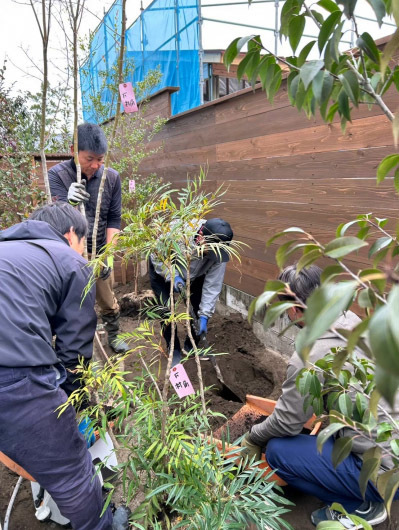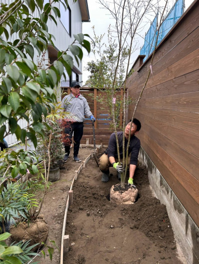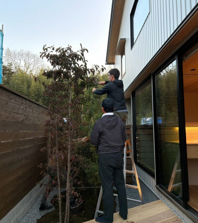 外構の仕上げは植栽工事。山から選んできたお気に入りの木々を配置していきます。