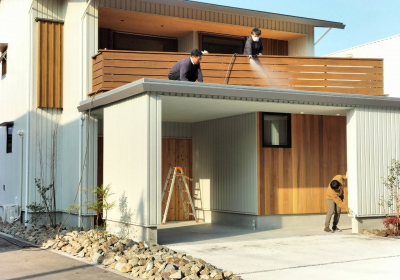 防水工事が終わると足場解体前の洗浄・磨き工程へ。