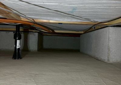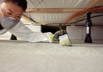 現場担当者自ら床下に潜り、最後の点検と清掃を行います。