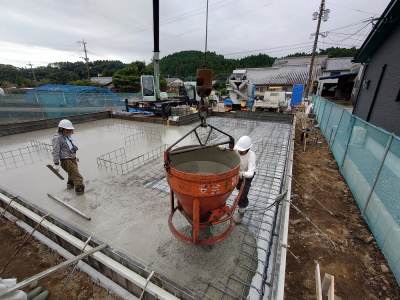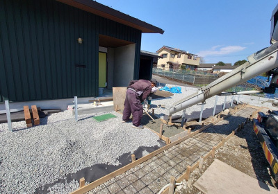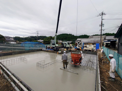 コンクリート打設は底盤部、立上り部、デッキ・ポーチ土間部と3回に分けて行われます。