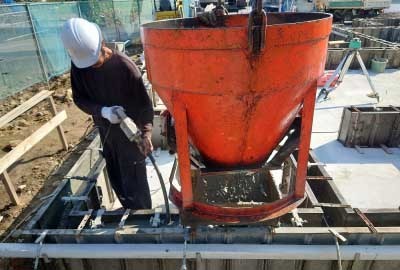 型枠の間に生コンクリートを流し込みます。
