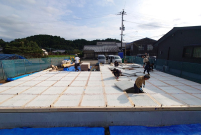 土台、大引きと碁盤目状に組み終えたら床断熱材を設置。