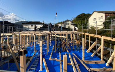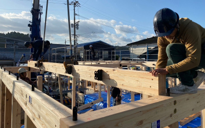 11月吉日、「二つ庭の家」の現場にて建て方工事を行いました。