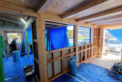 現場「二つ庭の家」はサッシ取付け後、内部壁の仕上げ工事へと進みました。