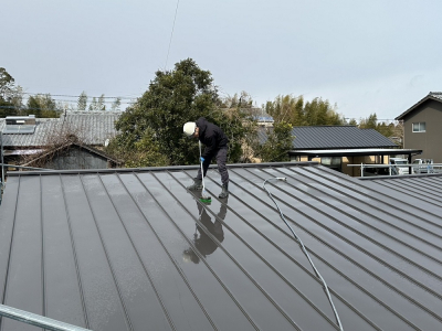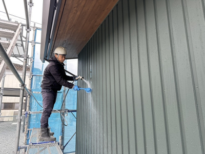 現場「二つ庭の家」は防水工事を含むすべての外部工事完了後、 足場解体前に屋根、外壁の洗浄が行われました。