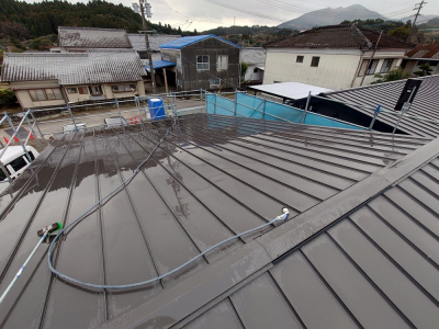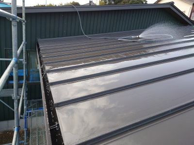 屋根から勢いよく水を流し、排水処理状況および詰まり等を確認します。