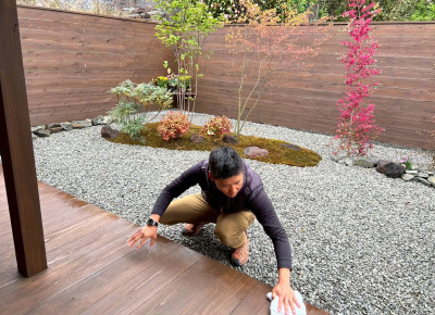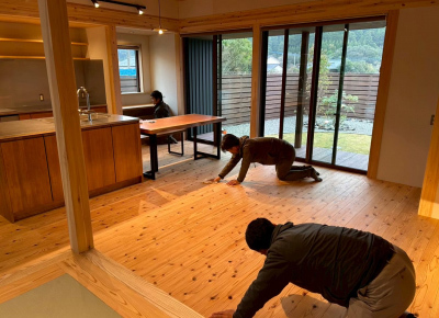 お施主様ご家族の生活が始まり、毎日触れる床や壁、柱を丁寧に磨いていきます。