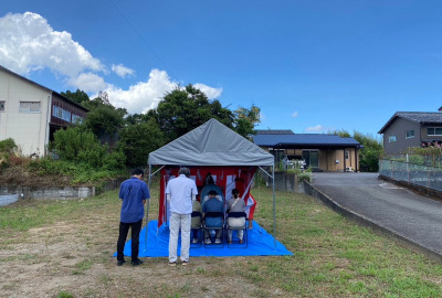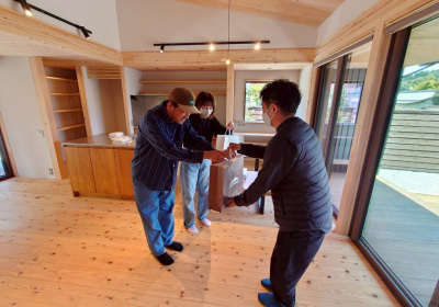 朝から駆けつけてくださったお施主様と完成を見守ります。