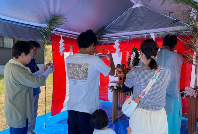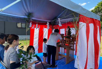 夏らしい大きな雲が漂う青空の下、神主さんの祝詞が響き渡り厳かに式が進みます。
