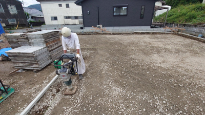 床掘りが完了したら、砕石を敷き均し転圧します。