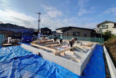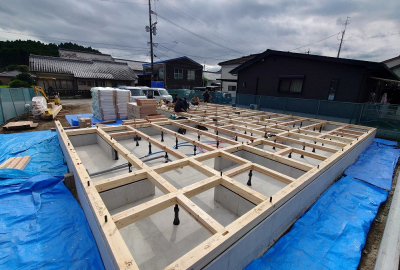 現場「二つ庭の家」は 基礎工事完了後、土台敷きの工程へと進みました☀