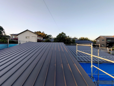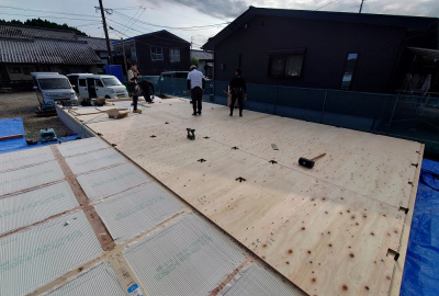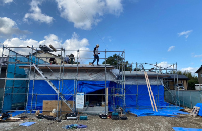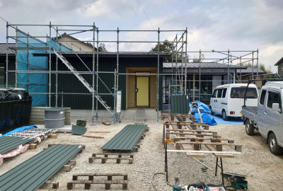 現場「二つ庭の家」では建て方後、ガルバリウム鋼板仕様の屋根工事が行われました☀