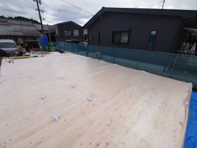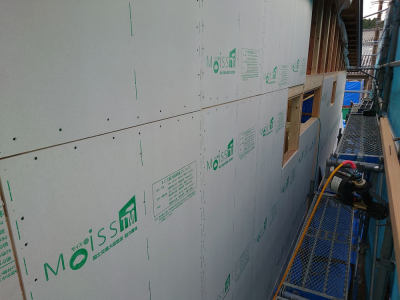外部の耐力面材の施工状況。