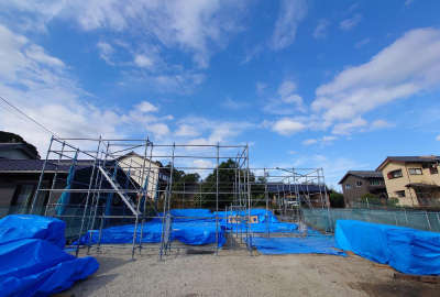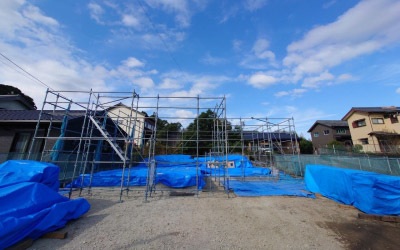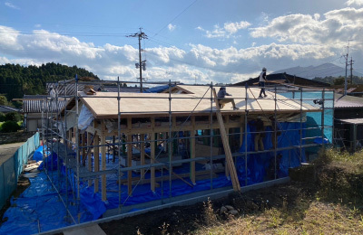 上棟後着々と工事が進む「二つ庭の家」の現場。