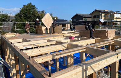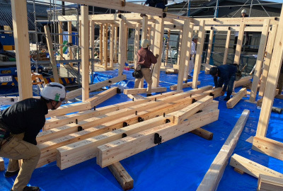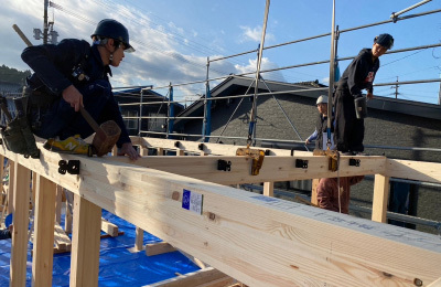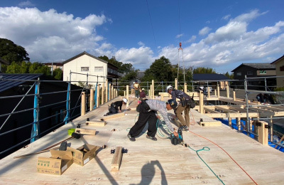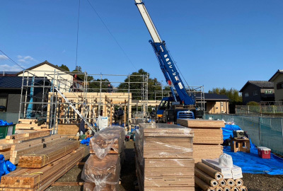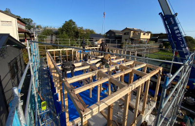 これまでの現場担当者の入念な下準備と、大工さんをはじめとする 各職人さん達の協力体制のもと、建て方工事はスムーズに進みます。