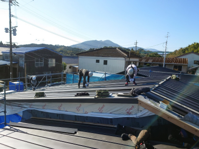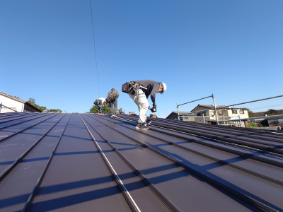 三人一組でガルバリウム鋼板の屋根材を順番に貼り合わせていきます。