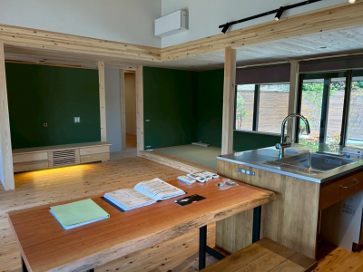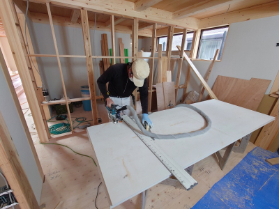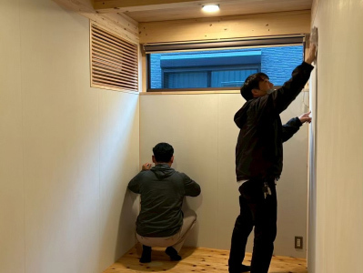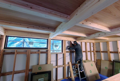 JIOによるお墨付きをいただいた 現場「二つ庭の家」は内部の仕上げ施工へと進みます。