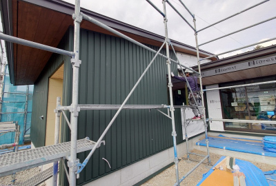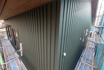 現場「二つ庭の家」の外部ではガルバリウム鋼板による壁仕上げ工事が行われました☀