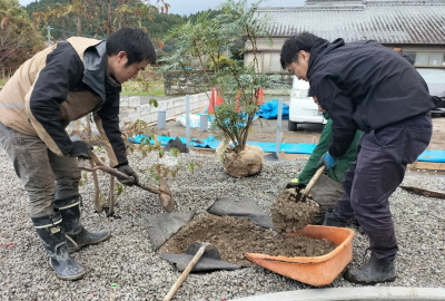 イメージをカタチに...計画していた植栽スペースに木々を仮置きしていきます。