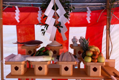 色とりどりの野菜や果物、立派な鯛が祭壇に並び準備万端です。