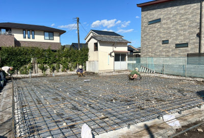 あらかじめ設定したGL高さに基づいて敷地を鋤取り、 砕石を敷き転圧した地盤の上に、鉄筋を配置します。