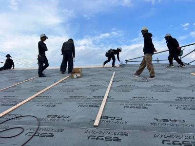 高さを感じさせない大工さんたちの軽やかな動きで順調に進んでいく屋根工事。
