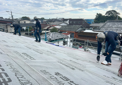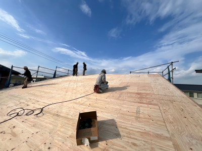 屋根下地材でしっかりと雨仕舞い、建物はブルーシートで全体を丁寧に包みます。