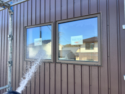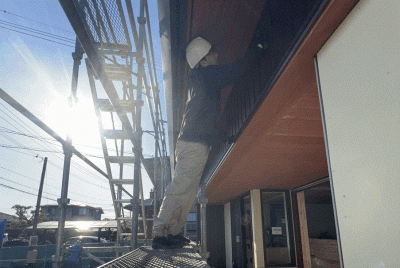 外壁を張り終えてコーキング処理を施すと、外部の磨き作業を行います。