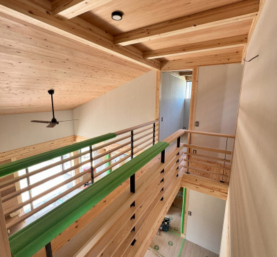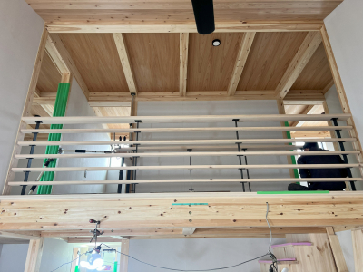 床工事を終え、吹抜け部分の手すり格子の取付へ。