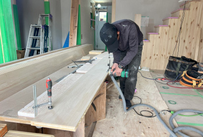 木材には、板目や節の多さにより様々な表情があり、 室内空間のどの場所に、どの面を向けるかを見極めていきます。