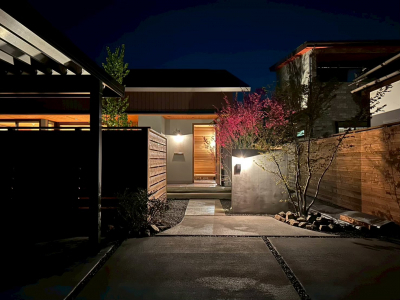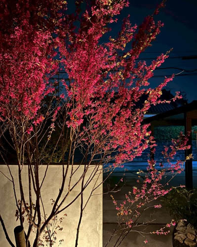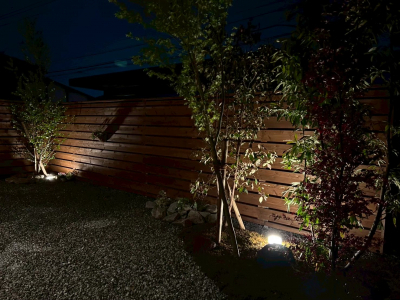 完成したお庭を眺めながら...照明のあたり具合を確認して現場をあとにします。