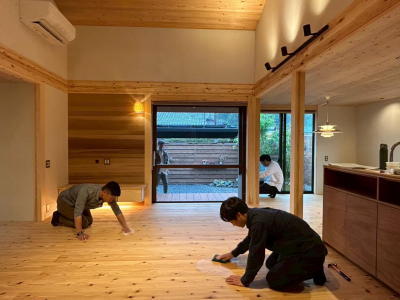 リビングやデッキの床を磨く...オーナー様が過ごされる時間を想像しながら感謝の想いを込めて。