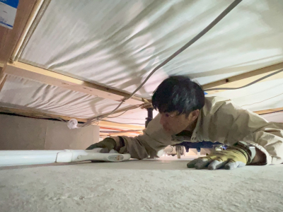 匍匐前進でしか前に進めない床下での作業は簡単ではありませんが、 オーナー様が心待ちにしている新居にごみひとつ残さない...