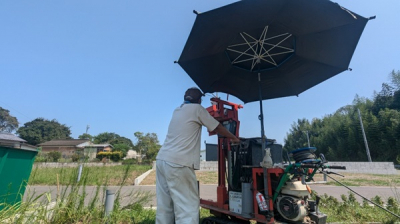 容赦なく照り付ける宮崎の太陽… 計測を行う機械も、「ウォン ウォン」と唸りを上げながら頑張ります。